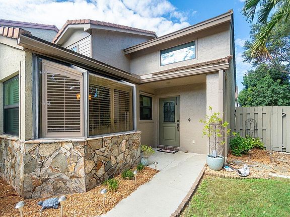 Nestled within the charming Gardens of Woodberry, in the heart of Palm Beach Gardens, and strategically situated between I-95 and the Florida Turnpike, a beautifully updated corner unit townhome awaits. This 3-bedroom, 2.5-bathroom abode boasts a two-car garage and an expansive driveway. The interior showcases a modernized master bedroom, bathroom, and an additional half bath on the lower level. Upstairs, two more bedrooms share a well-appointed jack-and-jill bathroom. This residence offers 1,895 square feet of air-conditioned living space, with a total of 2,327 square feet. Elegance abounds in the living area with its vaulted ceilings and open-concept living and dining room. The first floor is adorned with new greyish wood-look tile and wide baseboards. Notably, hurricane impact features safeguard the garage door, front door, windows, and patio doors in both the living area and master bedroom.