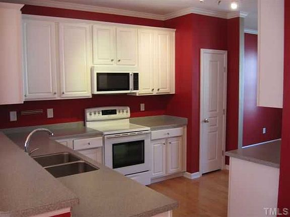 Hardwoods on main, open kitchen, formal dining. 4BR + 3 1/2BA + garage! Lrg mst w trey ceiling, bath w/tile flr, garden tub, sep shower & walkin closet. Covered deck off breakfast rm & patio off lower bedroom. 9'ceilings, Walk to community pool & fitness. Conv to downtown, RDU, RTP and NCSU!