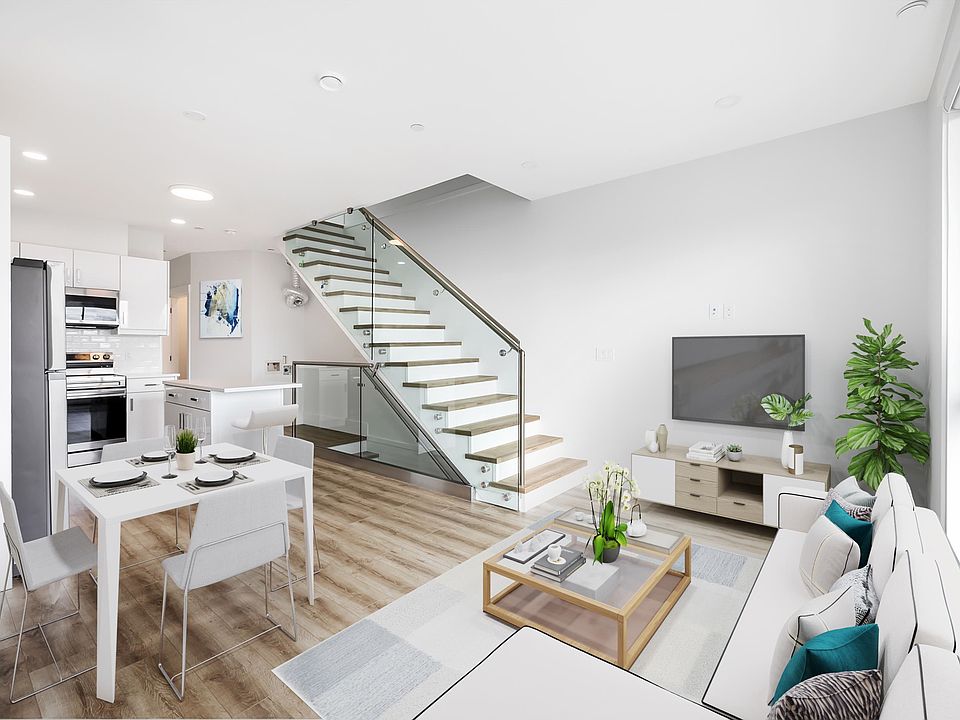 Executive Style 3 Level Townhouse, 3 bedrooms, 2 full bathrooms, huge large patios and balcony, 227 SF of Outdoor Space (professionally measured). Enjoy brand new build, quartz counter tops, stainless steel appliances, LED lighting, laminate floors, glass railings, skylights and so much more! WBI National Home Warranty. TH #6, #7 & #8 have no parking. Ample street parking available. FULLY RAINSCREENED building. Ready for immediate occupancy.