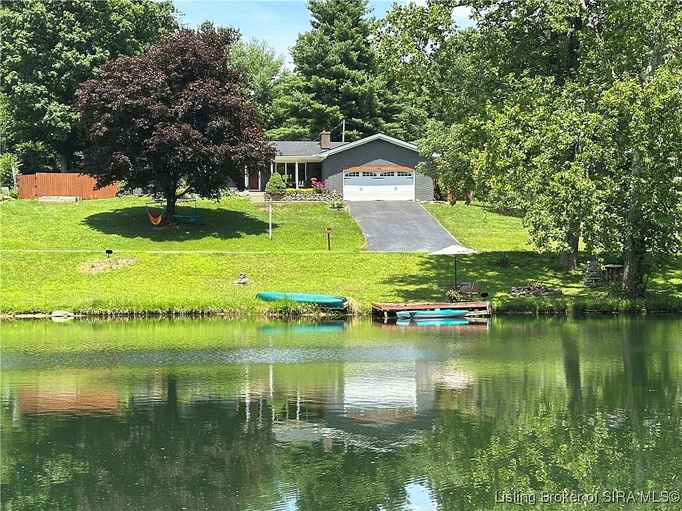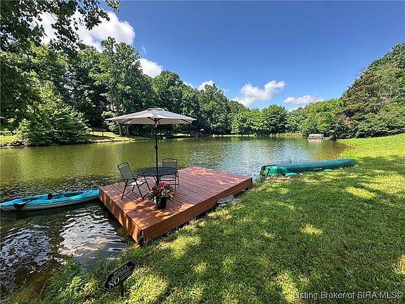 Welcome Home to your Lake Front retreat with a Brand NEW ROOF!!! With shared OWNERSHIP of a Private Lake you can enjoy fishing, floating and swimming all from your very own dock in your front yard. This charming one-level brick ranch is situated on a peaceful cul-de-sac street in a serene neighborhood with gorgeous mature trees. The living room features a wood burning fireplace insert with built-in cabinetry where you can take in the breathtaking views of the water which will dance with diamonds in the autumn and winter. Enjoy an abundance of natural light in the Vaulted great room with exposed wood beams and panoramic views of the back yard. Perfect for entertaining, the great room doors walk out on both sides to patio decks- one with a tranquil waterfall feature and built-in patio dining. Enjoy the sounds of nature in the expansive and fully fenced in backyard with a custom treehouse, chicken coop, firepit and an additional deck. Back inside, the Kitchen features gorgeous granite countertops with a breakfast bar perfectly adjacent to the central dining. The barn doors off the kitchen open up to the third bedroom which would also make a perfect office with patio doors and a waterfall view. Retreat away in the Oversized master suite featuring a Vaulted ceiling, new carpet, walk-in closet and renovated private bath. You don't want to miss this beauty in an AWARD WINNING school district in the highly sought after Floyds Knobs community!