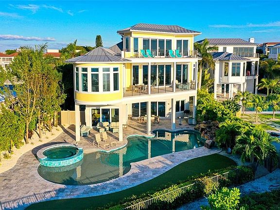 A beautiful paved private driveway leads you to this beachfront gem overlooking the Gulf of Mexico and gorgeous sandy Longboat Key beach. The home was completed in June 2017 and is the perfect mix of casual elegance that optimizes causal indoor/outdoor living with all the amenities. The open floor plan captures the amazing views from every vantage point through walls of glass and sliding glass doors that open to the outdoor seating area on two levels. The free form pool features a natural rock wall, sun shelf and adjoining 10 person hot tub. For dining and outdoor entertaining there is a Memphis wood pellet grill and smoker, an under counter outdoor refrigerator and ice maker plus a sink and counter bar. A private pathway leads from the pool to the beach. The interior floors are engineered walnut hardwood floors and premium ceramic tile. There is an elevator from the garage to all levels. The secluded master suite captures breathtaking beach views and sliding doors open to the terrace plus there is ample closet space and the master bath features dual vanities, tub and a large walk-in shower. Three en-suite bedrooms are also on the first living level with the fifth suite on the second level adjacent to a sitting area/game room that opens to an expansive deck. The kitchen is light and open with a bar for causal dining and an adjoining dining area with glass windows encompassing the views of beach and Gulf. There is a three car garage plus an additional one car garage with professionally installed storage and organization. A three hole putting green is in the front yard plus there is Wynn turf in all grass areas. A Sonos speaker systems is installed throughout the home plus surrounds the pool area. This is Florida resort living at its very best!