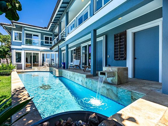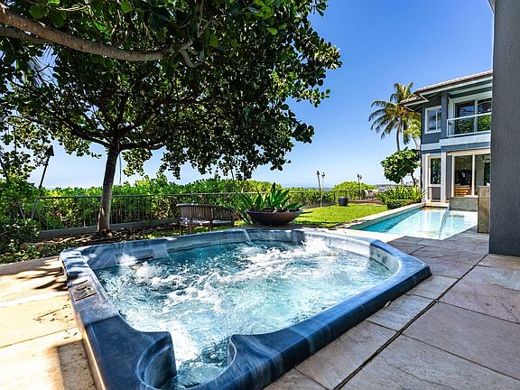 Step outside to the large, furnished lanai for alfresco dining with stunning ocean views. Unwind in the sparkling pool or soothing hot tub. The backyard also features chaise loungers for sunbathing and relaxation.
