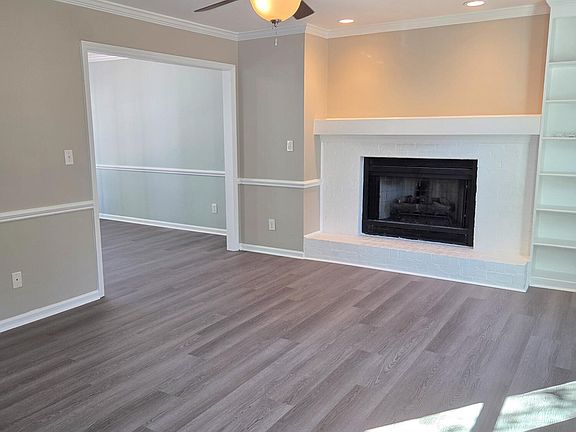 Gas fireplaceLarge deck overlooking backyardBuilt in shelves