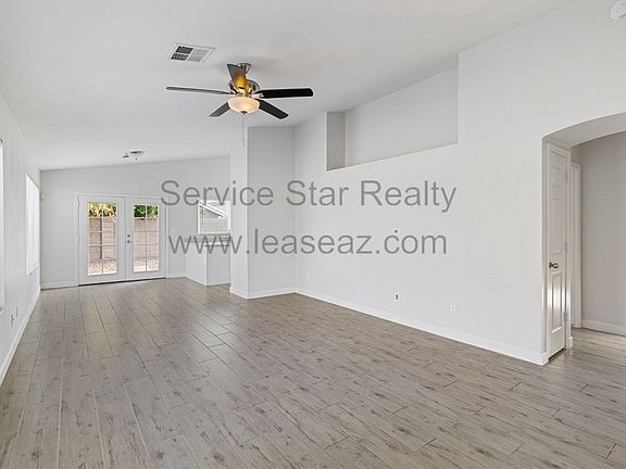 Spacious yardElegant wood-style flooringWhite cabinetryLight interiorLovely patioNeutral countersDesert landscape