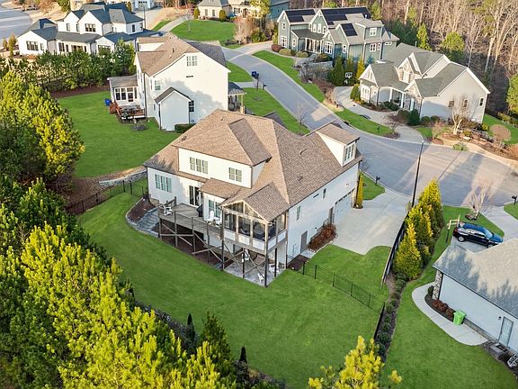 Situated on a cul-de-sac lot in the desirable Hamptons at Umstead, this former Mangrum Builders model home offers quality craftsmanship and thoughtful updates throughout. Interior features include hardwood floors, herringbone tile accents, crown molding, shiplap, custom 8' doors, and 10' ceilings on the main level with 9' ceilings upstairs. The dining room features a coffered ceiling, and the kitchen is well-appointed with custom cabinetry, built-ins, under-cabinet lighting, and in-ceiling speaker wiring. The home was repainted in 2023 and includes custom 2'' blinds throughout, with a remote-controlled shade on the living room's sliding doors. The functional floor plan includes a primary suite and an additional first-floor bedroom, ideal for an in-law suite, guest room, or home office. Upstairs are two additional bedrooms, along with a rec room and a bonus room. Outdoor features include a screened porch that opens to a stone patio added in 2023, a stone retaining wall and stairs (2022), black aluminum fencing (2020), full-yard in-ground irrigation, and exterior landscape lighting. Conveniently located with walkable access to the Raleigh Greenway and Umstead Park, the home is also close to Lenovo Arena, RTP, and shopping and dining in Crabtree and Brier Creek. Enjoy resort-style community amenities including a clubhouse, gym, pool, and splash pad.