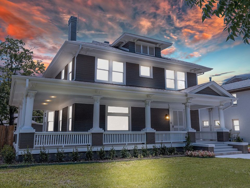 This 1916 Munger Place classic has been returned to its original glory. The wraparound front porch invites mornings with coffee or an evening space to gather with family and neighbors in this vibrant and revitalized historic neighborhood. Through the original front door is a new open floor plan for living flexibility. Stained glass windows throughout are original to the historic home. There is a new modern kitchen and a downstairs den, library or 4th bedroom with a third full bath. Upstairs is the primary suite and two more bedrooms. The new utility room is also on the second floor. The brand new baths throughout and the bedroom's walk-in closets give the home up-to-date amenities. A screened porch overlooks the backyard which has space for a pool. There is a new oversized garage and the separate casita is ready to become a gym, guest house or owner's private retreat. The restoration included the structure, roof, foundation and newly installed electrical, plumbing, HVAC and irrigation.