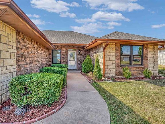 Wonderful updated home in great location, freshly painted new tile floors in kitchen & dining area, new roof 2025, LVP floors in living & all bedrooms. 3 bedrooms & office or 2nd sitting area. Large living area with fireplace, high ceilings, connected to big open dining & nice kitchen, breakfast bar, granite countertops, stainless steel appliances, primary bedroom with pan ceiling. Main bath has whirlpool tub & separate tiled shower. Covered patio & open patio. Big storage shed. Wood fenced in yard. Beautiful curb appeal. Call 580-248-8800 for private showings or text 580-581-7870 for more details.
