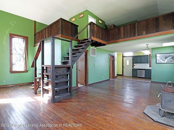 This unique one-room schoolhouse is a one-of-a kind home that is ready for upgrades and priced accordingly! In a lovely rural location, yet still close to all conveniences, this home retains its historic feel with its open layout, vaulted ceilings, and tall, original windows. The first floor features the kitchen which overlooks the front yard, an open dining-room living-room space with a Vermont Castings wood stove, a full bathroom, bedroom, and first-floor utility room with washer dryer hookups. There is also room to consider adding an additional bedroom in the open southwest corner. The loft features a spacious master suite with a walk-in closet and attached, open office space. The master bath includes a shower, bidet, Jacuzzi tub, and skylights which fill the space with light.
