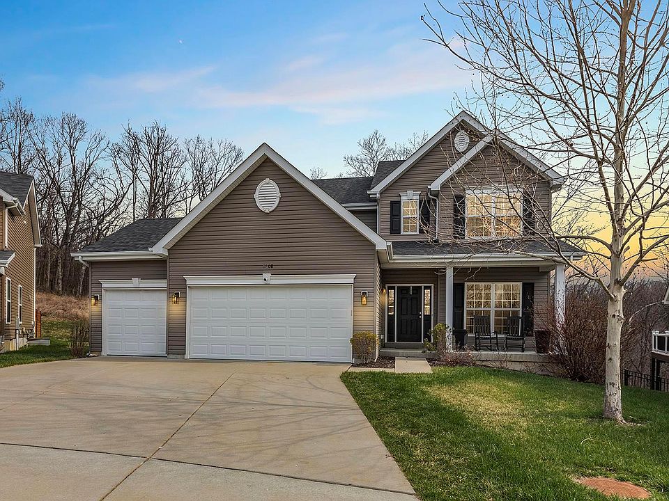 Stunning 4 bed, 3.5 bath home situated on a quiet cul-de-sac with a fenced, level lot backing to Greensfelder Park! Inviting entry opens to the formal office with French doors, overlooking the front yard. Just past the office, is the formal dining room - perfect for entertaining guests! The open-concept family room and kitchen span the entire back of the home. The family room boasts a gas fireplace and a five-bay window! In the spacious eat-in kitchen, you will find a butterfly island, stainless steel appliances, and 42" cabinetry. A powder room and large laundry room with built-in cubbies completes the main floor. Upstairs, the primary suite offers a large sleeping area, walk-in closet, and en suite bath with dual adult-height sinks, soaking tub, and separate shower. Three additional bedrooms and a second full bath complete the upstairs. The finished lower level is equipped with a spacious rec room, bonus room, and a third full bath. Highlights: 3-car garage and Rockwood schools!