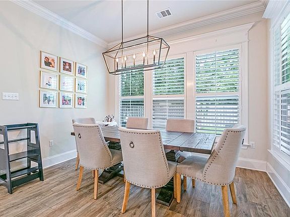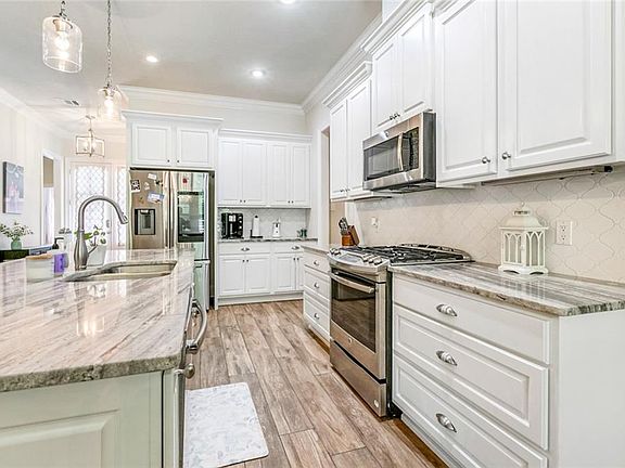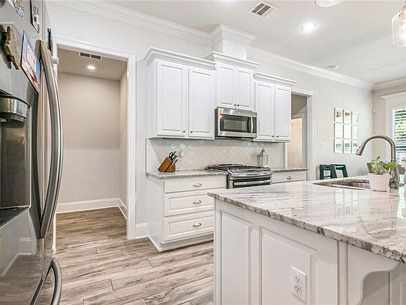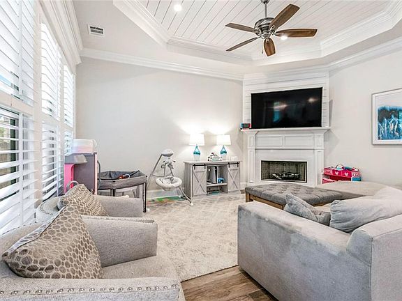 Beautiful Open Floor Plan with 4 bedrooms and 2 full baths. Prime lot backing up to greenspace with no rear neighbors. Includes a computer room/ office with built-in desk, great place for home office or homework. Den has tray ceiling with in laid ship lap wood, brick fireplace also with ship lap in lay and mantle. Wood look tile floors throughout, no carpet, great for easy maintenance. Spacious kitchen with over sized island & room for seating and lots of cabinets for storage. Kitchen boasts stainless steel GE appliances, gas stove, & 3cm granite counter tops. The den includes wood pediments over the windows with custom shutters. Large dining room with custom shutters. Spacious primary bedroom suite has a tray ceiling; inviting primary bath with double vanity, soaker tub , separate shower and granite counter tops. Laundry room has space for an extra fridge Fenced backed yard has brick covered screened in patio & large wooden deck in back for entertaining. Great for those crawfish boils ad bar-b-ques. Subdivision has beautiful large pool, clubhouse, walking paths, large play ground for soccer and playground equipment. Don't miss this one!