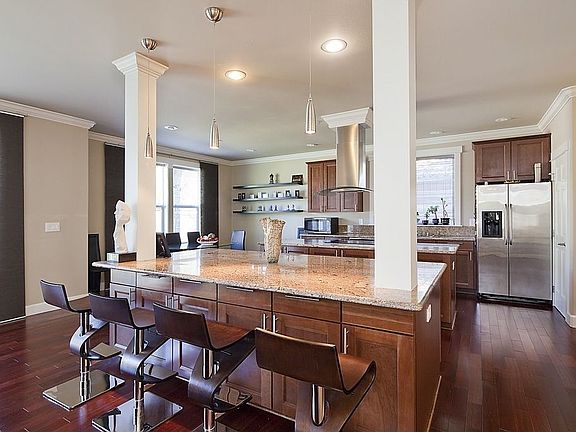 Custom built home full of beautiful details & finishes throughout. With 9 foot ceilings on the main floor, skylights & large windows this home is nicely sundrenced. Finished with Brazilian Cherry hardwood floors, Cherry cabinets, Italian porcelain, travertine, slab granite, and venetian plaster. Includes an office/den with french doors, expansive master suite, plus 2nd master & large family/media room. Home sits on a large private lot with garden area yet w/o restrictions or monthly fees.