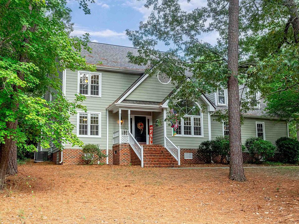 Wake Forest home off Burlington Mill Rd in the well established coveted Deerchase neighborhood. Cul de sac lot on ¾ acre, 3 BR (1st floor primary), 2.5 Bath also includes a huge bonus room and a flex room w/ a closet. The large kitchen has granite countertops w/ breakfast nook, office space and an opening into the family room where there is a lovely stone fireplace, built-in speakers and wet bar. Crown molding throughout 1st floor and the dining room has a huge dome window and wainscoting. Relax in the massive screened in porch that overlooks the beautiful backyard and enormous patio with stone brick pavers and a permanent double porch swing. There are two stairways leading to the upstairs where the hall overlooks the family room. The bonus room has ½ bath and a built-in chute to the downstairs laundry, the Jack and Jill bedrooms with the flex room for office or study are all located on the second floor. The two car garage and the multiple attic access areas are immense with tons of storage space. There is a built in central vac, roof replaced this year, HVAC replaced ‘19/’20 and no City Taxes and no HOA.