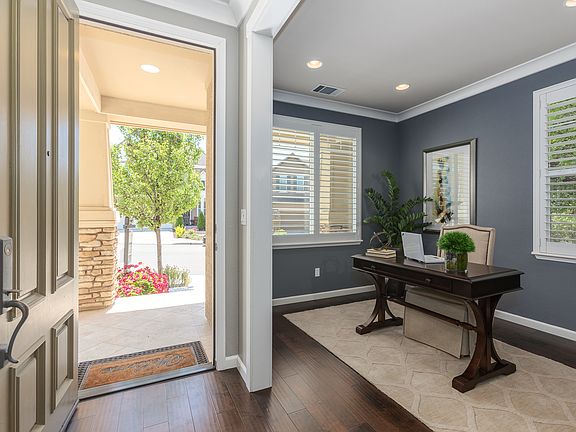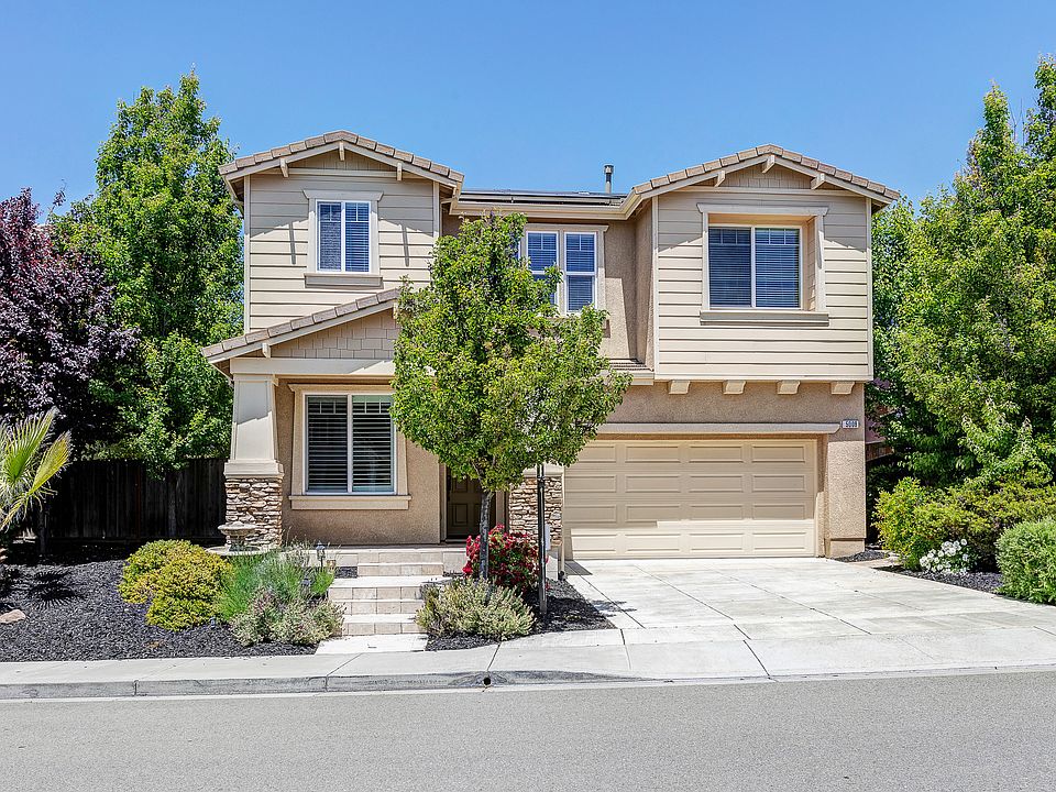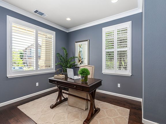 Owned Solar system,hardwood on 1st floor Den/optional 5th bed and 1 bath down-Formal dining room with upgraded light fixture, plantation shutters, crown molding and French doors to side courtyard-Living room with sliding door-Family room includes surround sound speakers, ceiling fan with lights, gas fireplace and plantation shutters-Kitchen complete with white cabinetry, center island, slab granite counters with full backsplash, French doors to yard, built-in desk, one vessel sink with pull-out faucet and stainless steel appliances including built-in GE Profile oven and microwave-2 lofts upstairs-Spacious master suite complete with 2 walk-in closets, stunning Mt. Diablo views, large Kohler soaking tub, walk-in shower with custom selected tile, dual sinks with white vanity and diagonally laid tile flooring-Other fine features include alarm system, upgraded carpeting, open spindle staircase and two-inch blinds-Low maintenance backyard with flagstone patio, brick seating wall and lighting