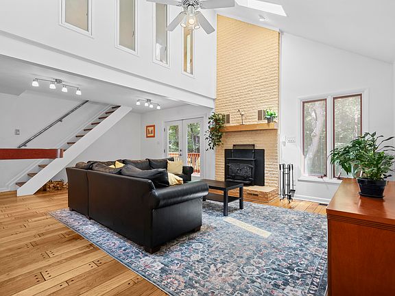 A Nature Lover's Dream with a Unique Private In-Law Suite. Discover this extraordinary Contemporary home offering complete privacy on 1.45 wooded acres in the sought-after Hunter Hills community of North Raleigh. With striking architectural details, soaring ceilings, and an open layout filled with natural light, this impeccably maintained residence blends modern design with the peaceful ambiance of a true retreat. A Standout Feature: Looking for versatility with style? This home delivers. It includes a magnificent private in-law suite/annex apartment, perfect for guests, extended family, or multigenerational living. Simply close the interior door next to the dining area to create a private residence with its own bedroom suite, full bath, kitchenette, laundry hookups, private deck, and separate front and rear entrances. This feature offers a fully independent living option while seamlessly integrating into the main home. The main level includes three spacious bedrooms, two of them primary suites, plus three full baths and one half bath. Upstairs, a loft with dramatic architectural lines offers open living space and a flex room—ideal for an office, studio, reading nook, or even a fourth bedroom with private lounge and half bath. The open living-dining-kitchen area is perfect for entertaining or everyday living, framed by woodland views and skylights that bring the outdoors in. Relax by the fireplace or step outside to one of two expansive decks to enjoy morning coffee, outdoor dining, or the serenity of nature. Recent updates include two HVAC systems (one new in 2024) and a new built-in cooktop and oven and patio doors. A long driveway with red pavers and ample parking adds both charm and convenience. An exceptional blend of architecture, privacy, and multigenerational versatility, just minutes from RTP, RDU Airport, Duke University, and everything Raleigh has to offer.