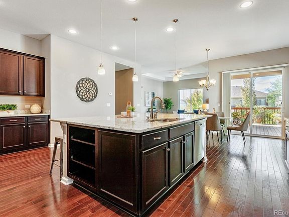 Don't miss this fabulous Copperleaf Ranch, just steps from the park and within walking distance to Award Winning Cherry Creek Schools! The kitchen is the heart of this home and will delight any chef with a gas cooktop, double ovens, a massive island that will seat 6, Maple Java Cabinets, and a walk-in butler's pantry. Want to Grill, have your morning coffee or enjoy the views and sunsets? Just step outside to your covered deck and gorgeous professionally landscaped yard. The Annette model by Richmond American features extensive Hardwood Floors, Coffered Ceilings, 10' ceilings, and New Carpeting. In addition to the kitchen on the main floor, you will find a spacious Primary Bed with ensuite, a Private Office, a Secondary bedroom, a full bath, and a Laundry Room. The finished basement is garden level and lets in the lights with 9' ceilings. It offers options for multigenerational living or additional entertaining with Media and Game areas and a HUGE Family Room, plus the 3rd bedroom and bath. Need flex space? This home has multiple locations to have an extra office, additional 4th bedroom, or gym to meet any of your needs. Wait, there is more...Sellers are offering a $10,000 incentive towards buyers closing costs with a full-price offer to help with the new interest rates!