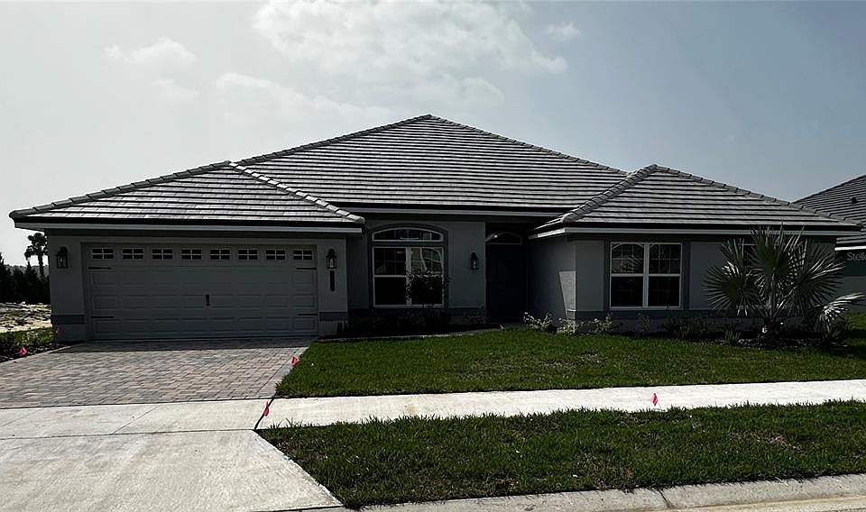This 3000 Sq ft home has 4 bedrooms and 3 baths, 2 car garage, lots of entertaining space and luxurious details throughout! Upon entering you will enjoy the open concept great room/dining room/kitchen with vaulted ceilings in Family Room, wood look plank tile in main areas, granite countertops throughout, 5 ¼ inch baseboards, wainscotting in dining room and much more. The owner suite is spacious with Tray Ceiling w/crown molding. Ensuite has double sink vanity with extra storage drawers, linen closet, 5" shower w/glass door and 2 walk in closets. The large lanai is impressive. 3 other bedrooms in the home share two baths. The exterior of the home has a tile roof and patio paver driveway, and patio paver covered lanai. This community is gated, has a gorgeous clubhouse with fitness center, pool overlooking the lake, basketball court, tennis court, playground, and community boat ramp. This is a must see home.