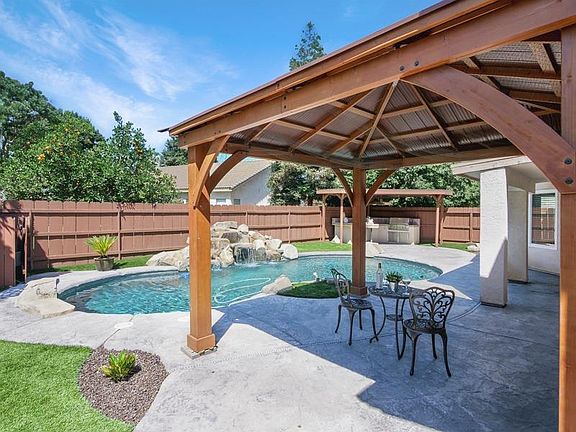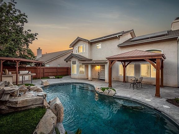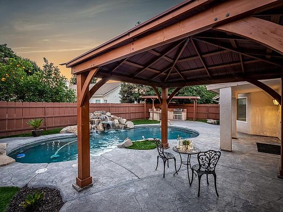 Striking McCaffrey built home with many upgrades throughout! The home has owned solar and an outdoor kitchen to host poolside with the pebble tec salt water pool just in time to beat the summer heat. The nicely landscaped backyard and gazebo give you a great place to host. There is plenty of stamped concrete and patio space. Enter the home into high vaulted ceiling and the beautiful kitchen has had an extensive remodel from custom soft close cabinetry to quartz countertops and Bosch appliances. One bedroom and bath are located downstairs. The upper master bedroom is spacious and has a large private bathroom with dual sinks, corian shower stall and separate soak tub. The master closet has custom cabinetry. The home is conveniently located near easy commute routes, plenty of shopping amenities and just down the street from Liddell Elementary. The 3 car garage helps for extra storage. Windows have been upgraded and the front yard fountain and lamp post give the home great curb appeal.