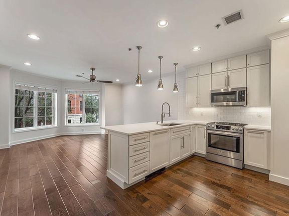 Other home features include a washer/dryer, ceiling fans, organizational closet systems, recessed lighting with dimmers, and smart home features like a Nest thermostat. This elevator building also offers a common courtyard on the same floor, a fitness center, and one deeded parking spot.