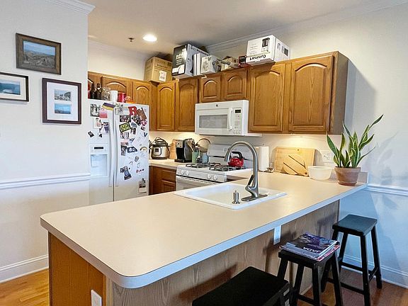Avail MARCH 15. Terrific sunlit 1 BR home on the top floor, with Eastern exposure and large windows and partial NYC views too. A great floorplan offers plenty of room in all the right places. The open Kitchen has great prep space & a breakfast bar for casual meals. There's also plenty of room for a dining table and a full living area for hosting friends. The bedroom is spacious. The bathroom is just the right size. More great amenities: a gas fireplace, hardwood floors, a washer & dryer, central air, under-cabinet lighting, crown & chair moldings, and an indoor parking spot included in rent. This is a rental in a sought-after condo building - Prospect Hill boasts a well-equipped exercise room, sunlit halls, 2 elevators, a putting green, and a serene, beautifully landscaped courtyard that is a colorful, urban oasis. All this and a wonderful neighborhood too. Hoboken's Northwest quarter is a tree-lined neighborhood where residents can enjoy local shopping or outdoor dining. A short tour will lead you past a gourmet cheese shop, a wine shop, craft beer shop, an upscale nail salon, ShopRite, dog runs, brick-oven pizzerias, dry cleaners, and beautiful Columbus Park with its great lawn, tennis courts & playground. Commuting is quick and convenient by bus or LightRail both within 3 blocks. This is the good life! Credit check req'd. 1.5 month security. 1 month realtor fee. Tenant is responsible for $250 move-in/out fee. No smoking in apt & no pets.