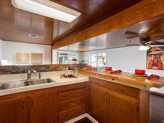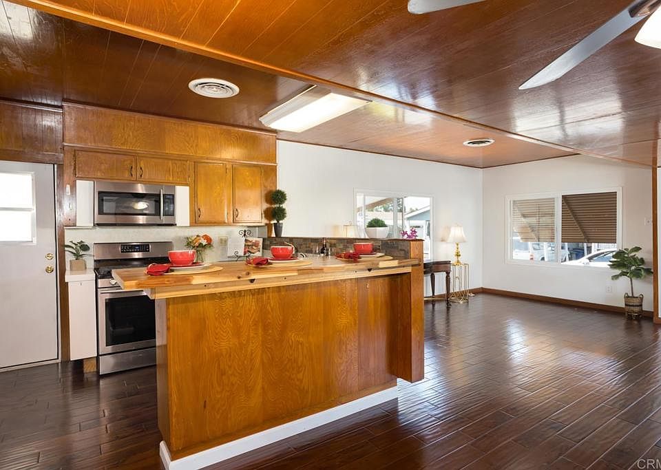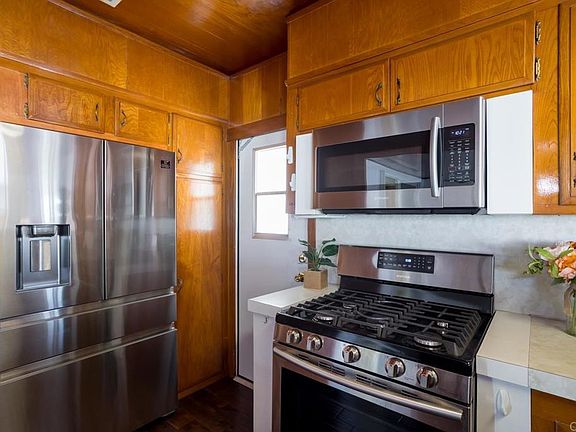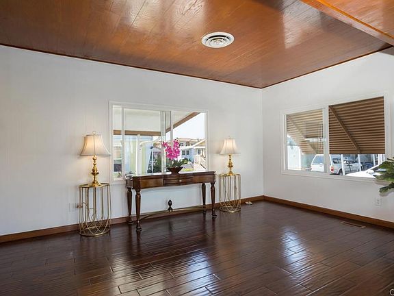 Welcome to this beautiful and spacious 1,064 sq. ft. manufactured home. This 1-bedroom, 1-bath home features an open floor plan, including a large living room, dining area with a ceiling fan, and a kitchen with a butcher block bar countertop. The kitchen also offers ample cabinet space and stainless steel appliances. The generous bedroom has a closet with mirrored sliding doors and plenty of windows, allowing natural light to fill the room. The well-sized bathroom features a shower stall and a gorgeous vanity. The enclosed California Room is currently used as a laundry room and provides direct access to the side yard. Additional improvements include hardwood floors in most areas of the home and freshly painted walls throughout. The carport accommodates 2 vehicles. Situated in the desirable Granada Mobile Estates Park, a 55+ community offering amenities such as a clubhouse, pool, spa, and guest parking. Conveniently located near shopping, transit, and restaurants. Low park fees and move-in ready!
