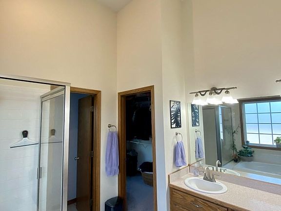 - Cathedral Ceiling, Garage Door Opener, Jetted Tub, Pantry, Security System, Walk-in Closet(s), Walk-in Shower, Ceiling Fan(s), Washer/Dryer Hookup, Eat-in Bar, Foyer, Smoke Detector(s), Formal Dining Room, Kitchen Island, Window Coverings - Blinds All, Water Softener - Owned