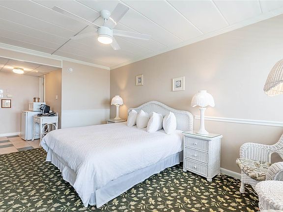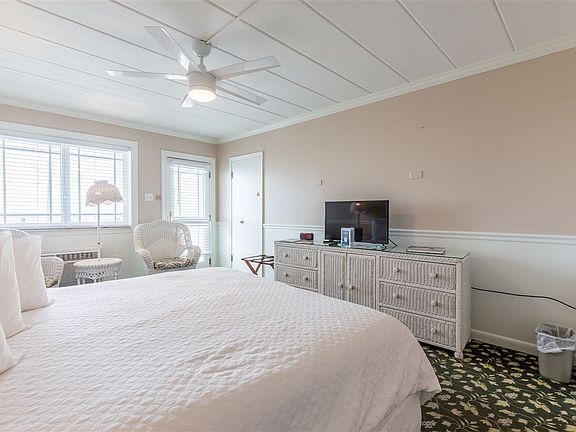 This unit is on the second floor with sweeping, panoramic ocean views from your private balcony. The unit has the following features: a king sized bed, bathroom, ample closet space, seating area, microwave & small fridge. This particular unit has a shabby chic decor which includes wicker furniture where you can relax by the windows. The Marquis de Lafayette is a Condo-tel so you own a condominium, but it is run as a hotel. The condo-tel is managed and operated by a full-time staff, manager, and governed by a board of directors. Owners of the units are required to rent their room(s) as a hotel room. The owner has access to use the room based on an allotted usage policy. The Marquis was recently renovated in 2016 and now includes the following; new outdoor, heated pool and hot tub next to the Barefoot Bar, and a new restaurant. The other amenities include; daily housekeeping, laundry facilities, fitness center, and meeting areas. There is off-street parking - something that is hard to find in the heart of the historic district of Cape May. Being in the center of town, you are close to popular stores, restaurants, and bars. Don't miss your chance to own a turn-key condo-tel on the beachfront of Cape May!