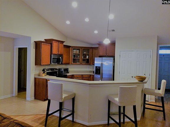 - Kitchen: Bar, Pantry, Counter Tops-Solid Surfac, Floors-Tile, Ceiling Fan, Recessed Lights