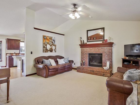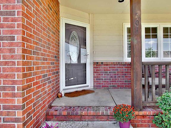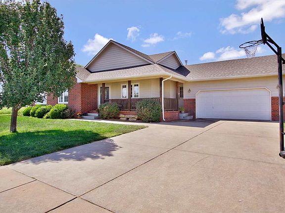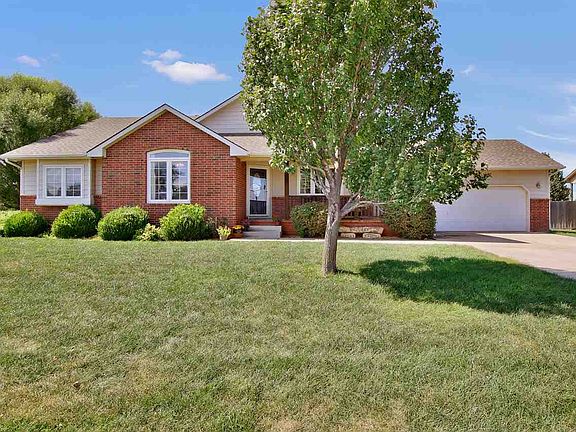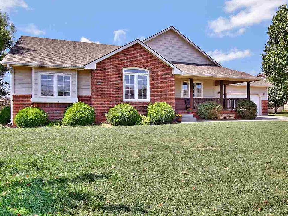 If it's living space your looking for you will get it with this great floor plan on a corner lot in a well-kept cul-de-sac. Tiled entry greets you to an open living room with bricked gas fireplace. Great light comes in through the front room window. Ceiling fan on 15-foot high vaulted ceiling. Berber carpet in living room. Kitchen is next with cherry wood cabinetry and custom made, movable island. Stainless steel appliances stay with the house including a four-month-old refrigerator and newer dishwasher and range. Coming off the garage into the kitchen homeowners will enjoy a large mud room and laundry room combo with exit door to front porch. Half bathroom also off the garage entry. Cabinetry also in garage entry for extra storage. Large dining room and sliding glass Pella door take you to the fenced-in backyard. Good-sized trees and custom concrete patio for homeowners to enjoy. Swingset can stay with the home. Rainbird custom sprinkler system, irrigation well and two garage-door openers. Hallway closet ready for coats and shoes and next to it is a linen closet for extra storage. Three bedrooms upstairs that are 11 x 10 and 12 x 11 each with a walk-in closet. The master bedroom is a major feature of the house at 16 x 14 with his and hers walk-in closets. You won’t find this many places. Large master bedroom windows feature view of backyard and possibility for sliding door exit. Ceiling fan on 15-foot high vaulted ceiling includes a dimmer switch. Master bath is absolutely the largest possible with corner tub under the window and separate shower across the room. You won’t crowd each other with two sinks with two separate vanities. Custom tile floor in the bathroom to match the backsplash. Full-finished basement with daylight windows offers a party room with custom ceramic tile, built in bar, wooden Wainscoating and bar bench seats built in. Super large storage room under the stairs. Custom shelves and cabinetry also built in. Family room features large view-out window with toy box built underneath. Full-finished, tiled bathroom offers linen cabinet and stand-up shower. Basement bedroom is enormous, with a walk-in closet and toy box built under the window. Roof is two years old, air conditioner and furnace serviced every six months by Roth Heating and Air. Enjoy excellent schools and exquisite ballfields and parks. Colwich has 3,100 linear feet of walking trails, bike paths, and a sand volley ball pit for recreation purposes. Small town living with the city just down the street.