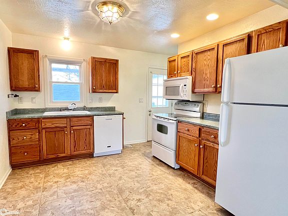 Move in Ready 2 Bedroom Home with great covered front porch, 14' x 24' attached garage, vinyl siding, and back deck with Pergola. Living room opens to nice kitchen with oak cabinets, including refrigerator, stove, dishwasher & microwave. Good sized 3/4 Bath (shower) and stackable laundry. 2 Bedrooms, Primary Bedroom larger. Open basement with mechanicals in the middle that has been tiled with a sump pump with back-up battery. Seller believes this home was totally renovated in 2006.