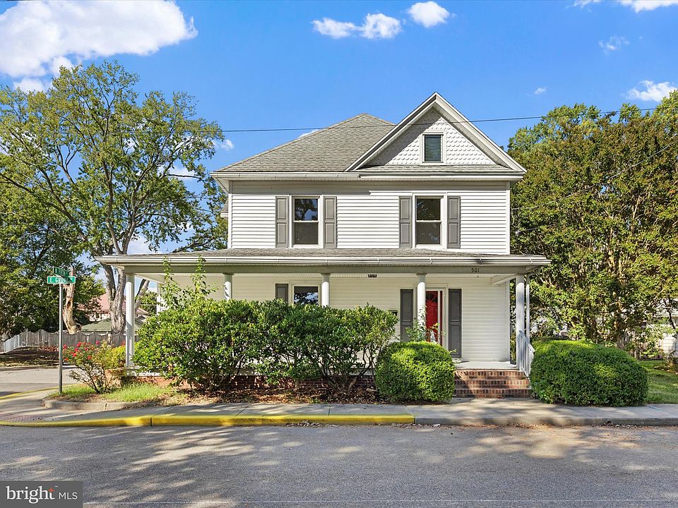 Step back in time with this 1910 Colonial beauty, where vintage character meets everyday comfort. Overlooking a peaceful park, this home invites you in with its brick front steps, wide wood porch, and timeless appeal that’s hard to find today. Inside, you’ll discover a home filled with original millwork including wide baseboards, detailed door trim, wood banisters, and solid doors adorned with antique hardware, each piece telling a story of craftsmanship from a bygone era. Much of the flooring has been updated with luxury vinyl plank, blending old-world warmth with modern durability. The spacious entryway and living room provide a welcoming first impression, while a cozy office with built-ins and a bow window makes for a perfect reading nook or workspace. The formal dining room features a lovely bump-out wall, plenty of natural light, and elegant wired wall sconces, creating an inviting setting for gatherings. The kitchen offers a touch of modern convenience with white and stainless steel appliances, recessed lighting, and twin casement windows above the sink that let in cheerful morning light. Just off the kitchen, the laundry room doubles as a powder room and offers a large walk-in pantry for added storage and function. From the dining room and kitchen, you can step into a bonus room that’s ideal for a playroom, exercise space, or a quiet reading area. Beyond that, a three-season room with screened casement windows and ceramic flooring provides the perfect spot to relax and enjoy the breeze. Off the 3 Season room is a large utility room with a workbench and shelving that’s great for hobbies or home projects. Upstairs, you’ll find four bedrooms and a full hall bath, all newly refreshed with brand-new carpeting. One bedroom features a lovely bump-out with three windows plus a side window, filling the space with natural light and adding architectural interest. A walk-up attic offers even more possibilities, already floored with finished walls and built-in shelving ready for storage or creative use. Outside, the property includes a large detached two-car garage with a convenient side street entrance. Additional features include a whole-house water filtration system and attic fan. With its blend of historic detail, thoughtful updates, and cozy country appeal, this home is ready to welcome its next chapter.