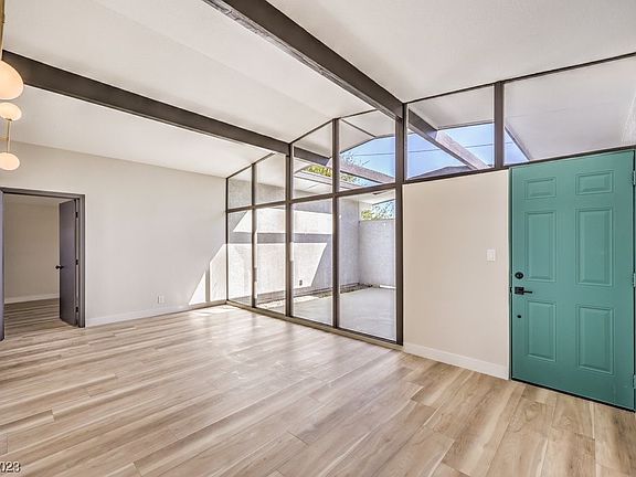 Beautifully remodeled, single-story home in cul-de-sac on corner lot! Home has enclosed courtyard, spacious backyard, vaulted ceilings, floor to ceiling window and exposed wooden beams throughout. Located with quick access to interstate 15 and minutes from the entertainment, casinos, and shopping of both the Las Vegas Strip and downtown Las Vegas. Customary kitchen with garden view, custom backsplash, new cabinets with gold hardware, stainless-steel appliances, and breakfast bar with sitting area. Bathrooms have been fully upgraded with hexagon tiled flooring, new vanities with gold hardware& framed mirrors, lighting, and modern tiled showers. Home has gorgeous interior finishes, custom light fixtures, painted accent walls, laminate wood flooring and plush carpet throughout.
