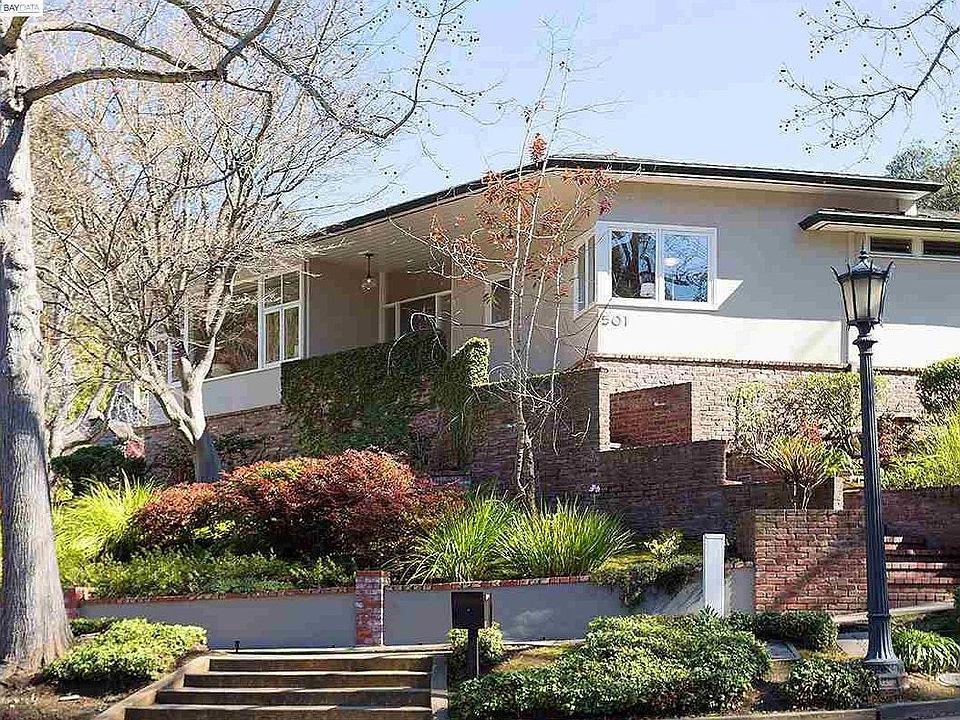 Mid-Century modern in great Piedmont location. Beautifully sited on large corner lot offering the ease of one- level living. Gourmet eat-in kitchen, Family Room with "Mad Men" wet bar, fireplace opening level out to rear patio/garden. Spa-like Master Bedroom retreat. Soaring ceilings, abundant light.