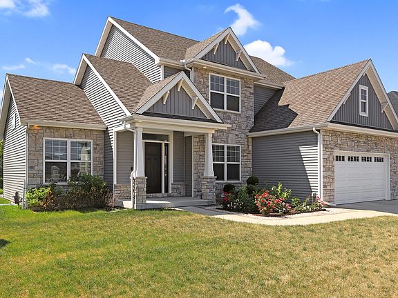 Stunning like new construction located in Savoy's beautiful Lake Falls Subdivision. The natural light is abundant with oversized windows that overlook your tree lined backyard view. Tall ceilings. spacious great room with gas fireplace and stone surround. There are 6 bedrooms and 4 full bathrooms with a full finished basement. This beautiful kitchen features white maple shaker cabinets, quartz countertops. large island, tiled backsplash and walk-in pantry. With a first floor bedroom/office with a full bath, drop zone, dining room and a 3 car garage. Upstairs you will find an oversized master bedroom, custom tile shower and spa tub, double sinks and large walk in closet. Three additional bedrooms, full bath and laundry finish out the second story. Finished basement with a large rec room features a gas fireplace, complete with wet bar, bedroom, full bath and storage. Schedule your showing for this luxurious home.