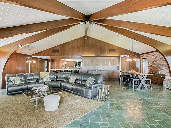 Experience a blend of mid-century modern architecture and resort-style living on the open waters of constant-level Lake LBJ. Nestled on 151 feet of lush waterfront in the sought-after Deer Haven community, this home celebrates timeless design and lakeside serenity. The main living area is circular by design and a true showpiece, highlighted by a vaulted wood-beamed ceiling that soars above expansive windows framing breathtaking lake views. A cozy fireplace anchors the open living & dining areas, which flow onto a wraparound deck and patio—perfect for enjoying morning coffee at sunrise or unwinding with spectacular sunsets. The efficient galley kitchen opens directly to the main living areas and features a spacious pantry and stainless-steel appliances. With three bedrooms featuring private en-suite baths, plus an impressive bunkroom with six built-in bunk beds, this home is well-equipped for hosting family and friends. A second family room and additional full bath adjacent to the bunkroom provide privacy and space for guests to relax. The primary suite offers private patio access and direct entry to the laundry room, which also connects to the bunkroom wing for added convenience. Outside, majestic oak trees shade the expansive lawn leading to a private boathouse, complete with a lounge area and storage for water toys. Whether hosting unforgettable gatherings or enjoying peaceful days by the water, this remarkable property delivers the very best of Lake LBJ living.