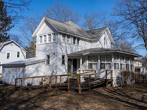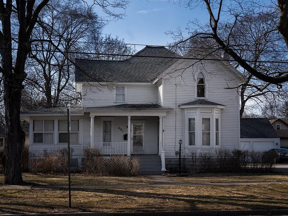 This Centennial home on Fancher Street built in 1884 is just waiting for someone to restore its beauty! The three gorgeous church windows, charm of the solar lamppost and the covered front porch will win over old home lovers. The huge windows that face the east bring lots of natural light to the living room. Cherry wood floors are under the carpet in the living room/dining area. Main floor features a built in china cabinet, a beautiful archway between family rooms and high ceilings. Bathroom is on the main floor and has been updated to include a walk in shower and new vanity. French doors lead to a three season room which was a favorite spot for the sellers to spend time. Four bedrooms on the upper level. Great space for an office near the north entrance. The backyard is huge as it is an oversized lot. The one car pole barn style garage was built in 1995 with high ceilings and lots of space for a car plus much storage. Home is being sold as-is.