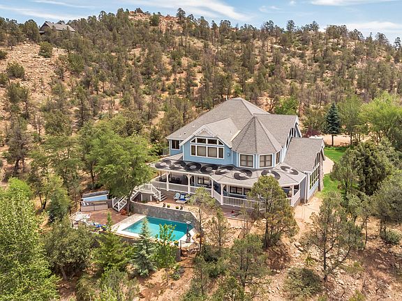 - Exterior Features: Covered Porch/Deck, Tall Pines on Lot, Storage/Utility Shed, Porch/Deck, Landscaped, Guest Quarters, Covered Patio, View of Mountains, Patio, Dog Run, Panoramic Views, Work Shop, Sprinklers, Pool, Drip System, Barn/Stable, View of Town, Stall/Corrals, Enclosed Patio