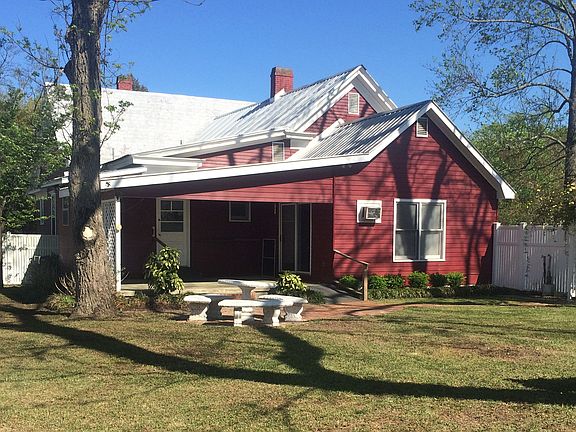 1891 Gabled Cottage with Bay Window Front Bedroom. Numerous updates & renovations. 3 spacious bedrooms with 2 full baths (handicap features). Shining floors (Oak/Pine/Tile) 12 foot ceilings throughout ; Modern kitchen w appliances, fenced private back yard with area behind for gardening or extended outdoor use. Numerous additional buildings on property including work space and covered carport w/storage space; Bonus room off covered back porch and landscaped brick backyard area with concrete benches/table/sm fountains. vented heating / air; move in ready in Historic neighborhood surrounded by other historic homes.
