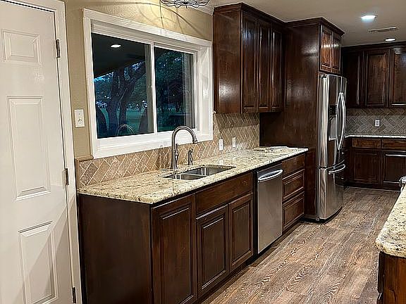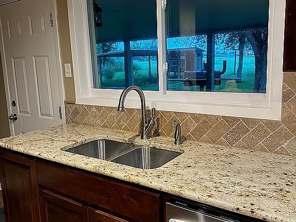 Nestled in a perfect location, this rustic ranch style home is right outside of city limits with the convenience of town just a couple of blocks away. The home sits in the middle of an acre lot with several trees. This would be a perfect home for a small family! The home features 3 bedrooms, 2 1/2 bathrooms with an open layout in the main space. The large kitchen is perfect for those who love to cook and entertain! Equipped with stained custom knotty alder cabinets, level 3 granite and travertine backsplash. The large island is a feature as soon as you walk in the front door. Waterproof Karndean vinyl plank flooring in the main space with high-end Mohawk carpeting in the bedrooms makes the home feel large and cohesive. Both bathrooms have level 3 granite as well. Samsung appliances are equipped in the kitchen, including: refrigerator, slide-in cooktop/oven, and dishwasher. Outside, a shed & lean provides plenty of storage and a home for your mower. A large custom chicken coop also sits in the backyard (could also be a great dog run). Luxury vinyl flooring - 2016 Kitchen remodel - 2016 Roof - 2017 Carpeting - 2021 Lighting throughout - 2021 Water heater - 2021 Gutters - 2021 Shed remodel - 2022 Front porch columns - 2023