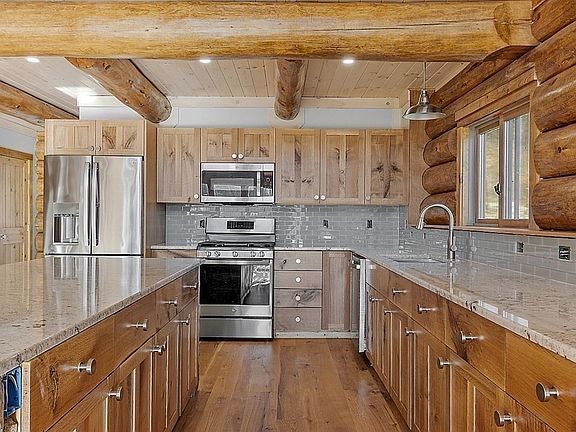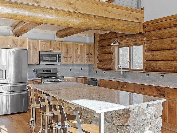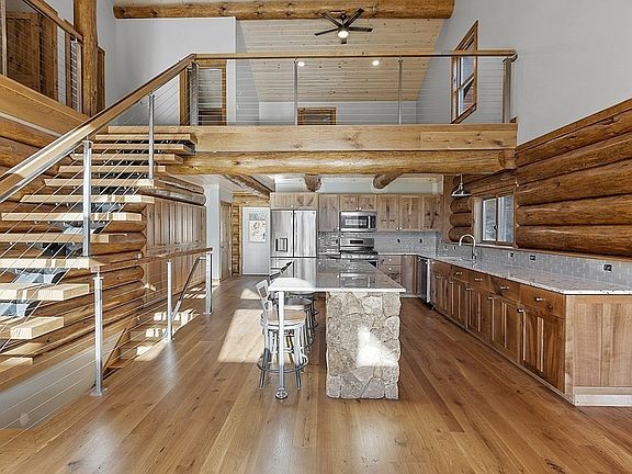 Come see this gorgeous log home today! This 3 bedroom, 3.5 bath home sits on a massive, private lot on a beautiful dirt road. This is the quintessential log home design with vaulted ceilings, a 2nd-floor loft and a custom floating staircase. The kitchen features white oak cabinets, a tile backsplash, granite counters and a center island with natural stone surround. The open living/dining area has floor to ceiling glass, giving you a gorgeous view of the front yard and fields across the street. The 1st-floor main bedroom features custom closet built-ins and a full bathroom. The office features a custom built-in live-edge desk. The 1/2 bathroom and laundry area complete the 1st-floor. The 2nd-floor features 2 bedrooms, the loft area and full bathroom. The finished basement features a propane fireplace with natural stone surround, a bar and a utility/laundry room. Whole-house generator. Owned solar. Radiant heat. White oak floors. Mini-Splits for A/C. Paver patio. Access to horse trails.