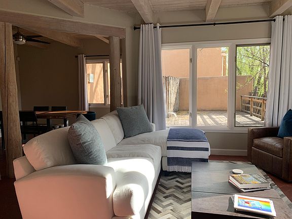 Rare opportunity to live downtown Santa Fe! Walking distance to historical downtown Santa Fe (10 minute walk to the plaza). This Condo is right under 1600 square feet, unfurnished and features updated appliances, a large deck in the back, covered patio in the front and a fully fenced and private back yard. End unit with space around - the one unit attached is a vacation home. Very private nook and secure home with an optional security system. Updated washer and dryer, water heater, AC (swamp cooler), classic Santa Fe brick floors - Community amenities include a fully functioning spa (hot tub) year round and seasonal swimming pool, off street parking spots. Great storage throughout the condo, cleaning/maintenance closet, coat closet, generous size closets in both bedrooms. Very quiet neighborhood with easy access to all Santa Fe has to offer - Art galleries, restaurants, museums, hiking, skiing etc. 20 minutes from Ski Santa Fe. Rent this place and live the Santa Fe dream. Open to a 6 month lease or longer. Tenant responsible for water, gas and electric bill - HOA fee's and all other fees covered by landlord. Minimum lease term of 6 months - 1 year. No smoking on property. Subletting not allowed unless approved by landlord and written into lease agreement.