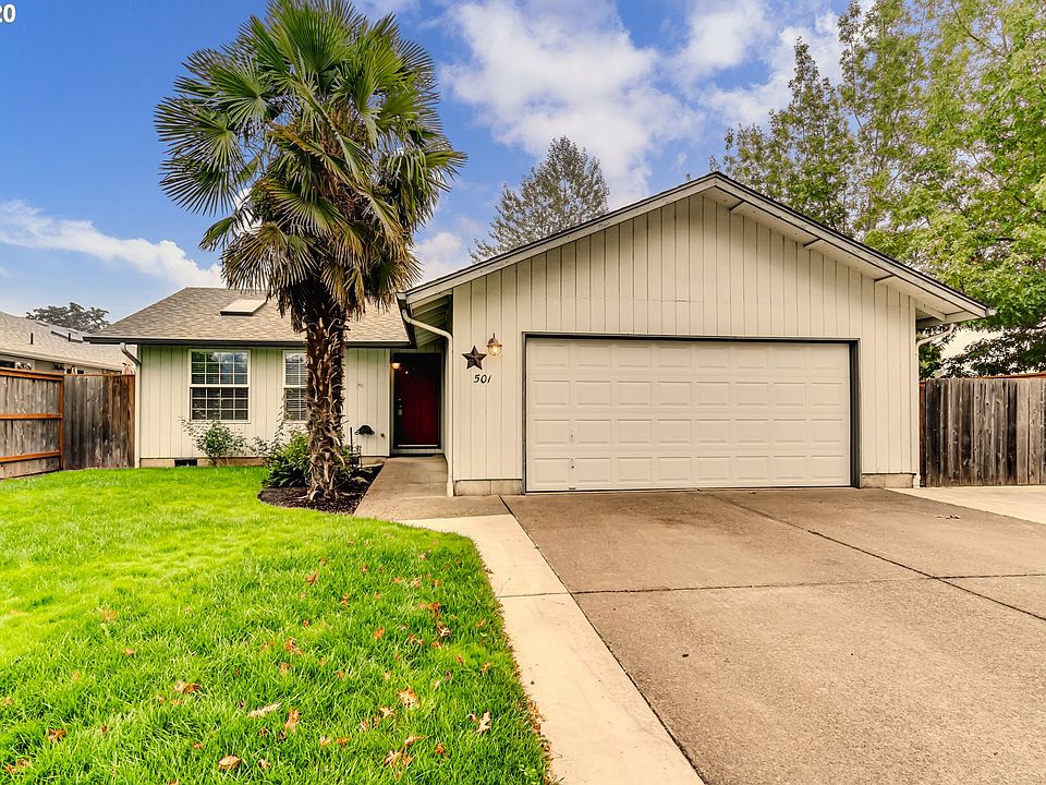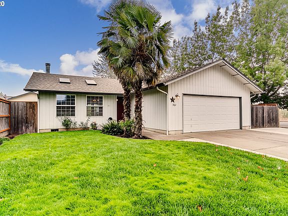 Well maintained home for sale in West Eugene. 1260 sq ft, 3 bedroom & 2 bath to call your own! Living room is open with a vaulted ceiling, new skylights and a wood burning fireplace. Kitchen has nice oak cabinetry. Interior utility room with cabinetry, all appliances included. French doors open to a fenced backyard with a large patio and new fence. Front and back sprinkler system. Huge gated RV pad & newer roof. Close to shopping and schools.