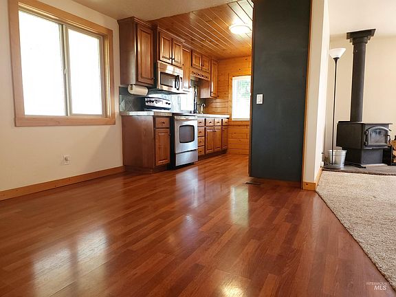THE MOUNTAINS ARE CALLING! This darling 3 bed, 1 full bathroom single level home is perfect for a starter home or mountain getaway. Equipped with Stainless steel appliances in kitchen, beautiful wood molding and doors, and a nice flow of natural light throughout the home. Located downtown New Meadows, close to services, and short drive to McCall. Hit the slopes with a 20 minute drive to Brundage Ski Resort then warm up with a nice soak in Last Chance hot springs or a fuzzy blanket next to the wood burning stove in the cozy living room. Fully fenced lush lot is a safe playground for your furry friends. 8x12 shed has power. This corner lot offers ample parking for family, friends, RV, summer and winter toys!