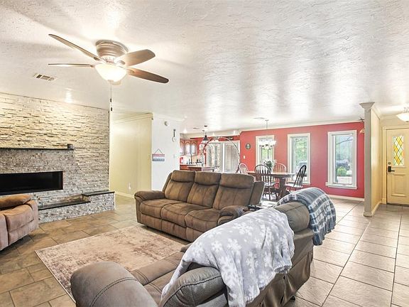 Open-concept living area with a stunning stone gas fireplace w/ remote,