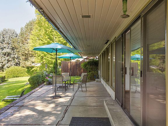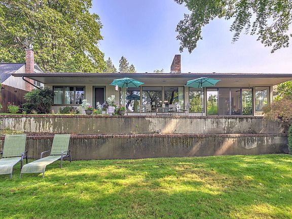 Riverfront-1953 Mid-Century modern gem makes debut! Serene oasis or Entertainers dream? Embrace the charm as your eyes are immediately drawn to the captivating riverfront views. This single level abode is a spacious 3,159sf, 3 bed, 2.5 bath offering a glimpse into a bygone era.The interior is bathed in an abundance of natural light from the floor to ceiling windows; accentuating the beautiful Mahogany wood finishes.Coffered ceiling in the living room w/wood burning fireplace while the family room has its own gas fireplace & opens up to a stylish dining area with wet bar; setting the stage for dinner parties. Glassed-in sitting room leads to a patio,seamlessly blending indoor/outdoor living. The