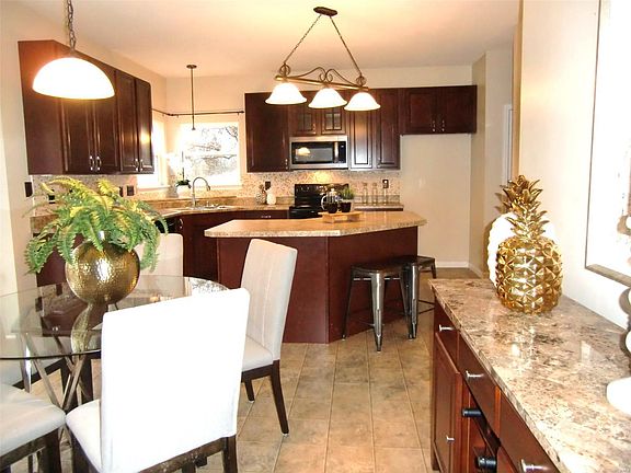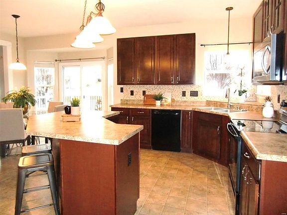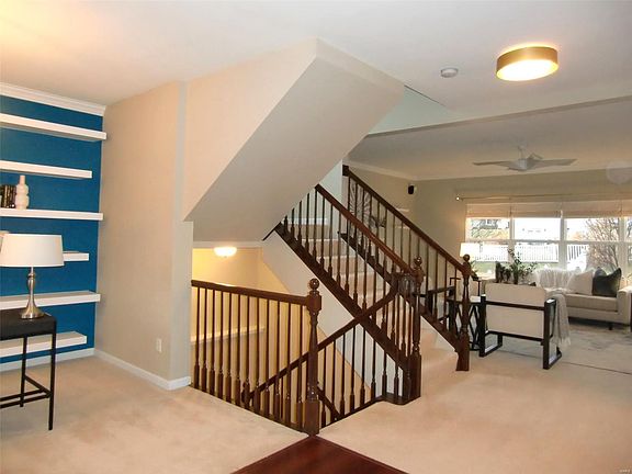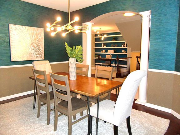 Come see this beautiful 15 year-old home in St. Peters --perfect location! Great curb appeal with brick/vinyl exterior/covered front porch! Spacious foyer immediately shows off the columned archway leading to the dining room, living room/office with built-in shelving. Great room features gas fireplace...surround sound stays! The breakfast room has a bay window and opens to the kitchen with 42" cabinets, stone backsplash, center island and pantry! A powder room and laundry room complete the main floor. Upstairs master suite with crown molding, coffered ceilings, master bath w/ dual-sink vanity, tub/separate shower, and ceramic flooring. Massive walk-in closet! Three additional bedrooms all have walk-in closets! Newly finished rec room with bamboo flooring, wet bar w/ quartz top, sink and room for a beverage fridge. Plus egress window for your safety! A composite deck with landscape lighting and vinyl fencing! For you EV drivers, a charging station in the garage. Make it yours now!