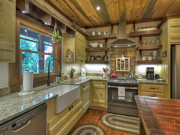 Charming & Quaint Nearly New Construction Cabin just minutes from historic downtown Blue Ridge - walking distance to deeded Toccoa River access & commons area...Custom features throughout with rustic flair and modern touches, Stainless appliances & granite counters in chefs kitchen, flowing great room/dining area features sky-high ceilings & stone fireplace, plentiful windows, Wrap-around porches, oversized party porch w/ massive stone outdoor fireplace great for entertaining or relaxing, full finished terrace level makes excellent guest quarters , lovely mix of textures, finishes & colors for a "lodge" look, gentle and lush landscape, Tucked away in a cozy gated community close to town & golf course, perfect for a full-time home or much-needed getaway -great rental potential - make it yours!