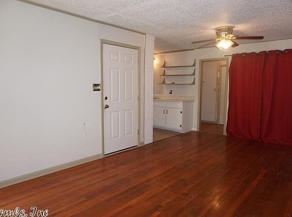 Large living /dining with hardwood floors, 3 bedrooms and 1 bathroom on 1 side and master bedroom and bathroom on the other. Galley style kitchen, large sunroom, new windows, laminate flooring, nice carport and small storage building will stay. House has a metal roof.