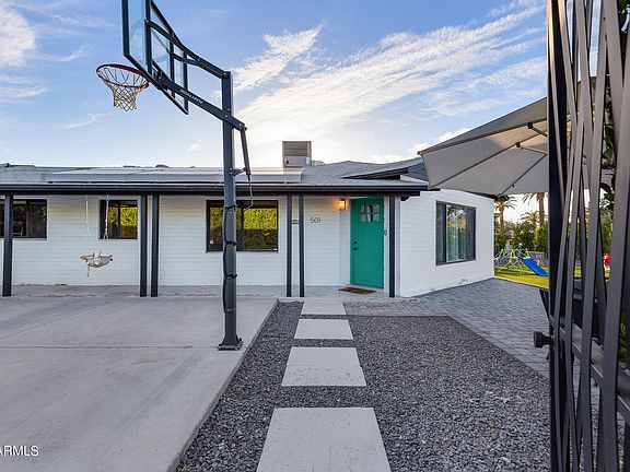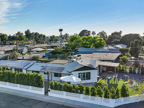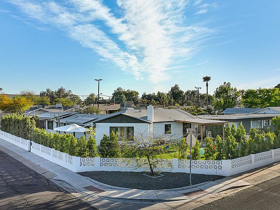 Rare opportunity to own one of the most unique homes in the heart of Downtown Chandler! This mid-century gem has all the historic charm you're looking for along with the modern amenities to make it home. Sitting on a huge corner lot with original maple hardwood flooring wood-burning fireplace and a modern/industrial kitchen with concrete floors & butcher block island. Split layout with 4 bedrooms, 2 charming bathrooms, office/den, dining room, breakfast room and the one of the nicest yards you'll find featuring mature landscaping, turf grass, a sparkling pool and 2 separate & private outside areas to enjoy thanks to the custom fencing/trees lining the property. Plenty of room for the whole family, and steps from all the entertainment Downtown Chandler has to offer! Pool and Landscaping package of over $190K was added since last sale. Mid century brick fence, Indian Laurel privacy hedges, basketball court with 2 glass backboards, 3 pergolas, pavers throughout the property, large turf areas for low maintenance enjoyment, windows, interior and exterior paint completed, custom metal gates, and almost all plumbing replaced. 6 person traditional heat barrel sauna currently in backyard conveys with the property