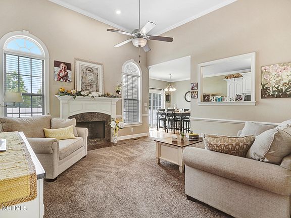 The first thing you'll notice upon entry are the tall ceilings and natural light that floods every corner of this lovely home. The built-in fireplace creates an inviting ambiance perfect for cozy nights in with loved ones. The roomy living area flows seamlessly into the dining and kitchen area, making it ideal for entertaining guests or enjoying family meals.