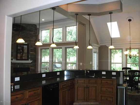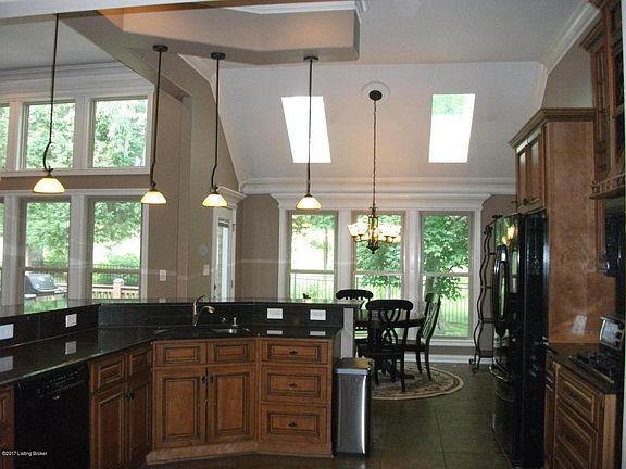 Don't miss this Beautiful 4 BR 3 BA Brick Ranch with a finished walkout in Oldham County. Lots of Wow factor in this home! Gorgeous great room with 12ft ceilings, stone fireplace, recessed lighting, crown molding, large columns and cherry wood flooring. Open formal dining room with wainscoting and custom plantation shutters. Gourmet kitchen with maple cabinetry, granite countertops, gas cooktop, double ovens, and slate marble flooring. Spacious dining area with large windows, sky lights and deck access. Beautiful pendant lighting over granite counter breakfast bar. The oversized master features a double trey ceiling, recessed lighting, and custom plantation shutters. Ceramic tiled master bath, soaking tub, granite countertops and skylights. Large master walk in closet